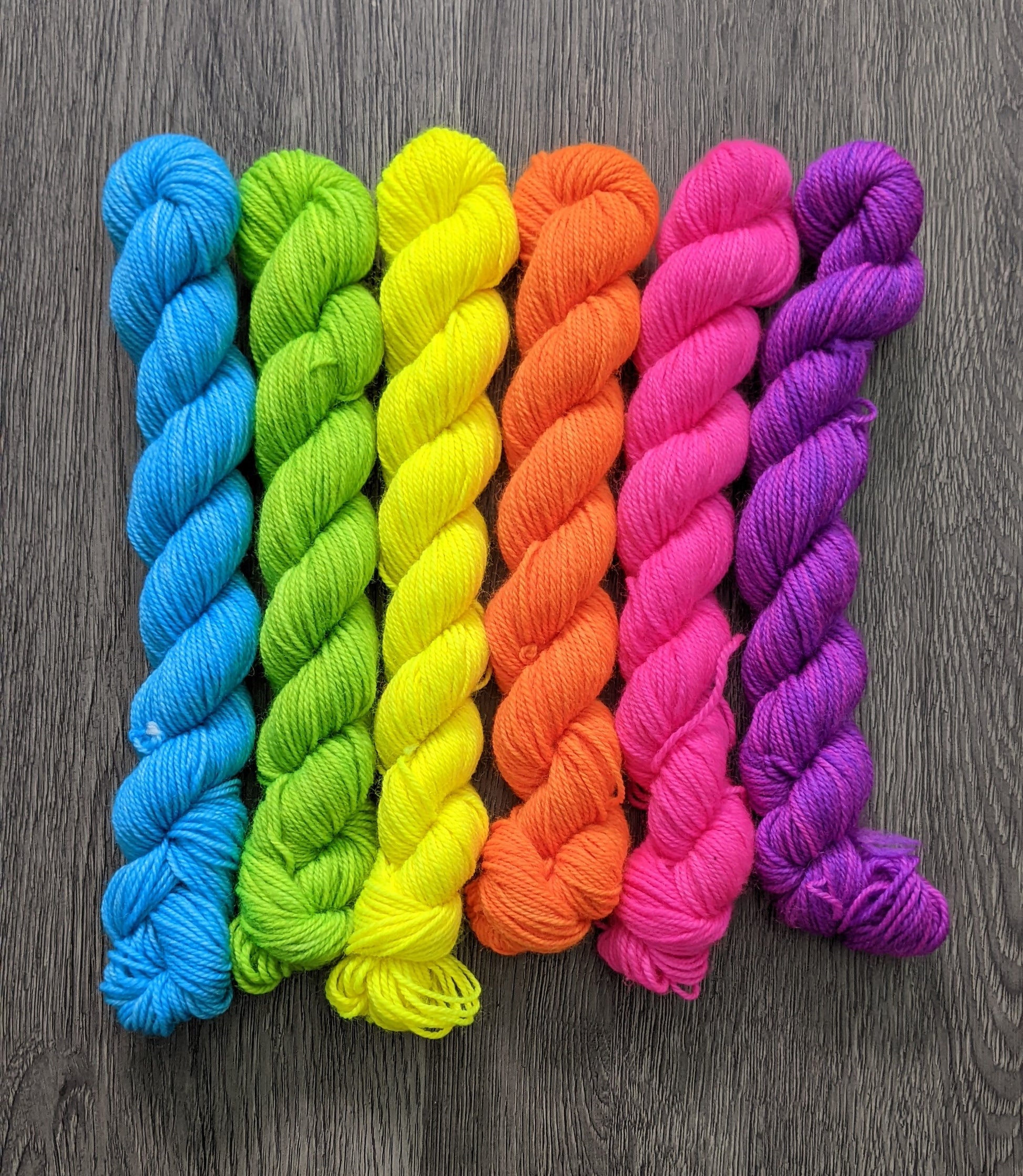 Ensemble de 6 minis écheveaux de laines teintes à la main. Ces ensembles sont parfaits pour vos projets nécessitant plusieurs couleurs différentes en petite quantité.