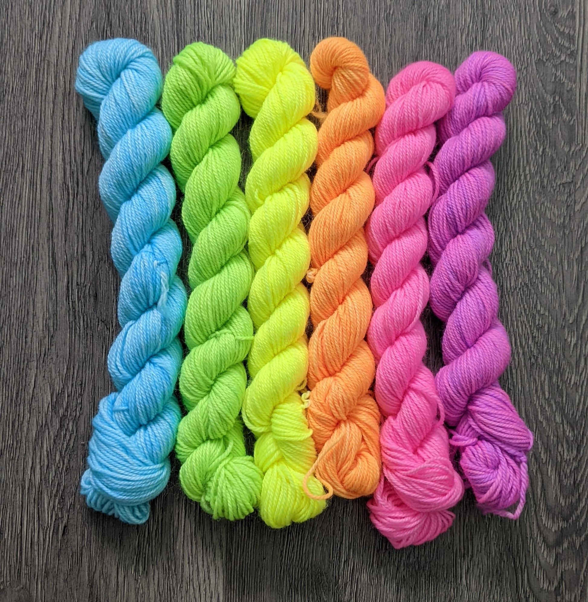 Ensemble de 6 minis écheveaux de laines teintes à la main. Ces ensembles sont parfaits pour vos projets nécessitant plusieurs couleurs différentes en petite quantité.