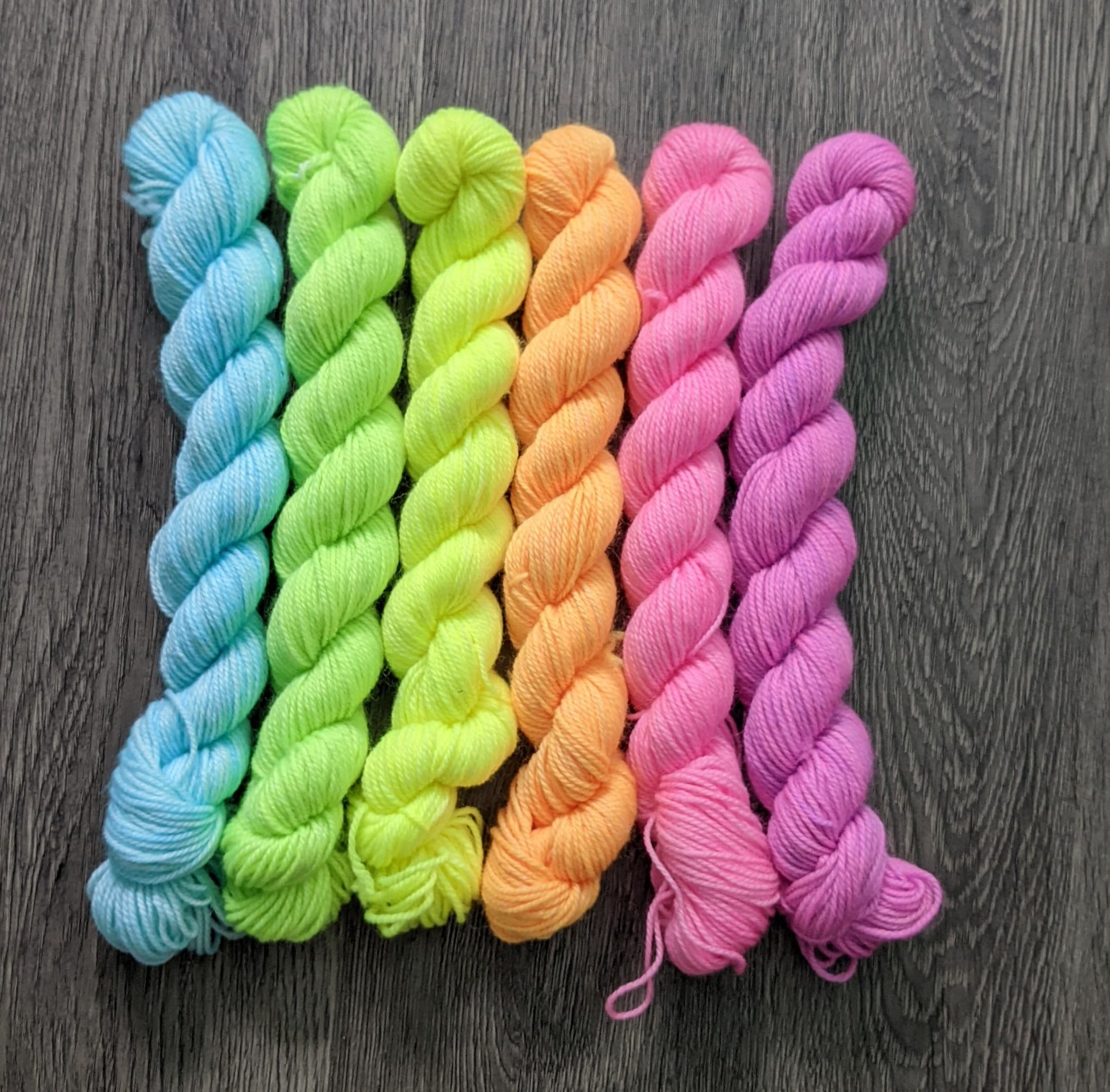 Ensemble de 6 minis écheveaux de laines teintes à la main. Ces ensembles sont parfaits pour vos projets nécessitant plusieurs couleurs différentes en petite quantité.