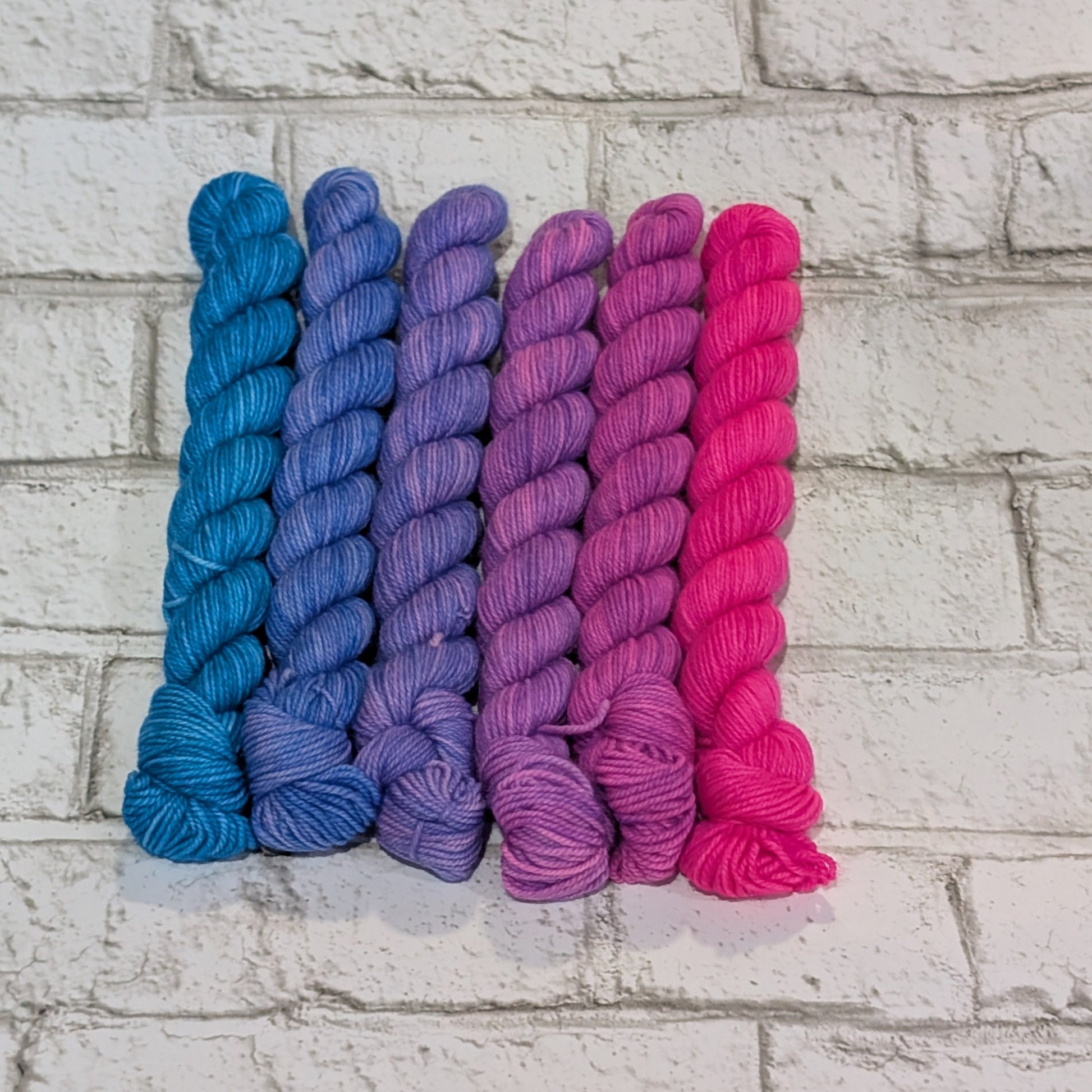 Ensemble de 6 minis écheveaux de laines teintes à la main. Ces ensembles sont parfaits pour vos projets nécessitant plusieurs couleurs différentes en petite quantité.