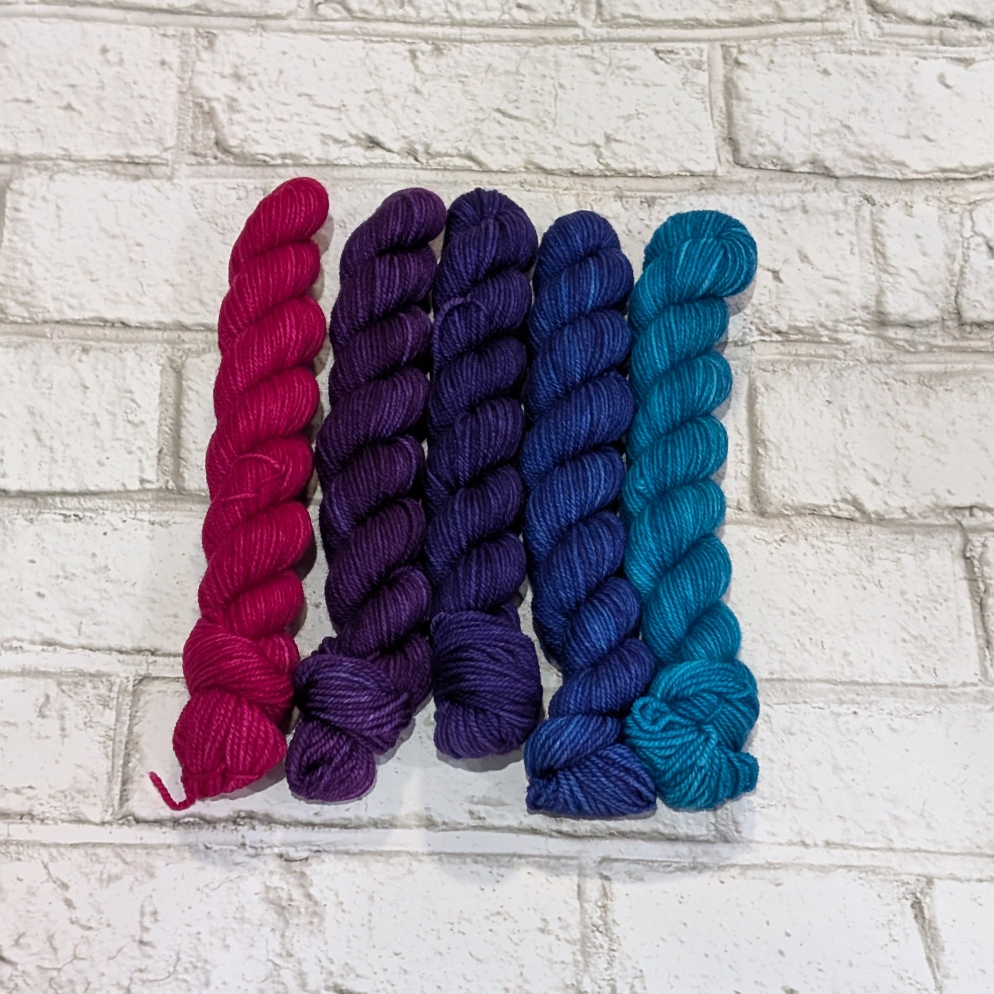 Ensemble de 5 minis écheveaux de laines teintes à la main. Ces ensembles sont parfaits pour vos projets nécessitant plusieurs couleurs différentes en petite quantité.