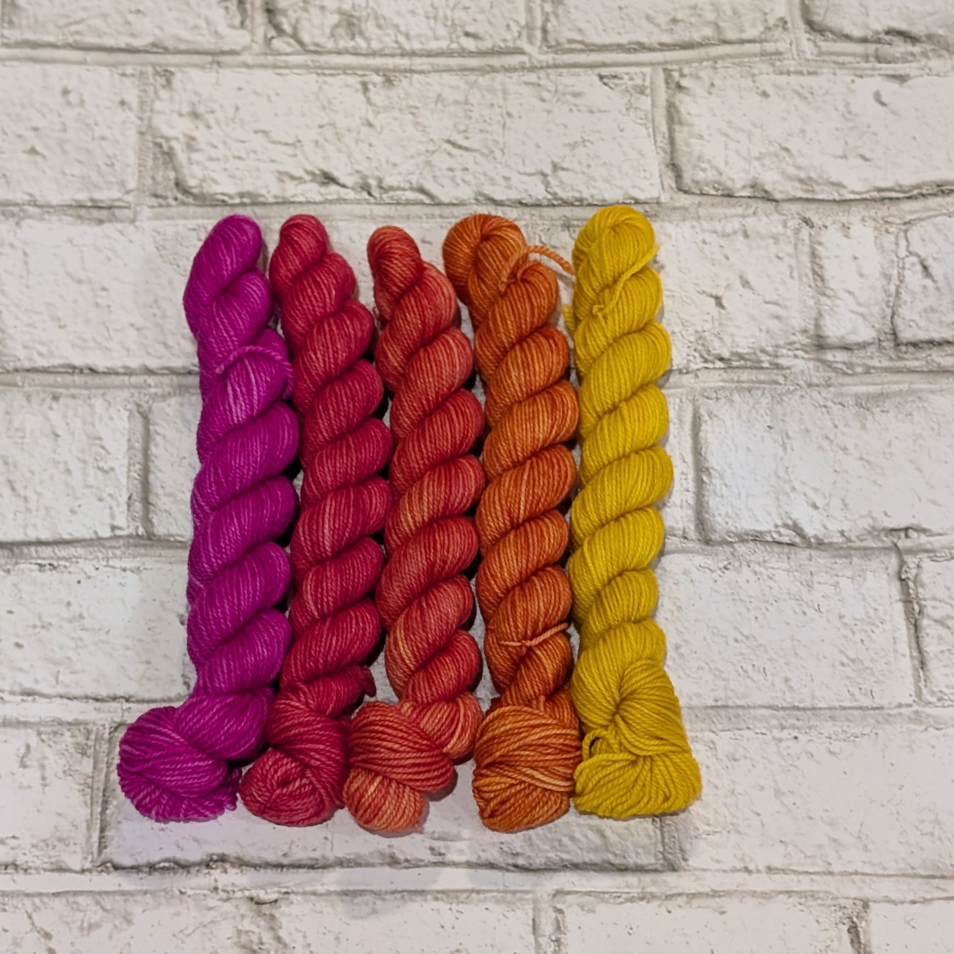 Ensemble de 5 minis écheveaux de laines teintes à la main. Ces ensembles sont parfaits pour vos projets nécessitant plusieurs couleurs différentes en petite quantité.